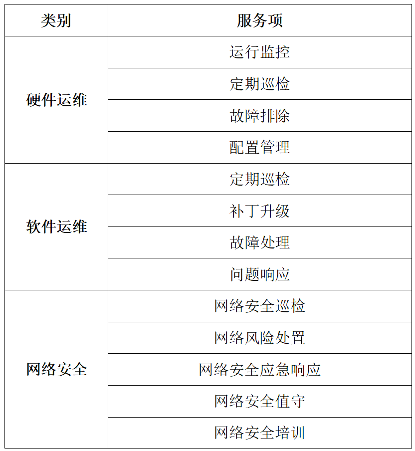 2.1采購范圍:結合公司業務開展情況,本項目服務內容主要包括硬件設備、軟件系統、網絡安全的日常維護服務。服務內容清單詳見下表。